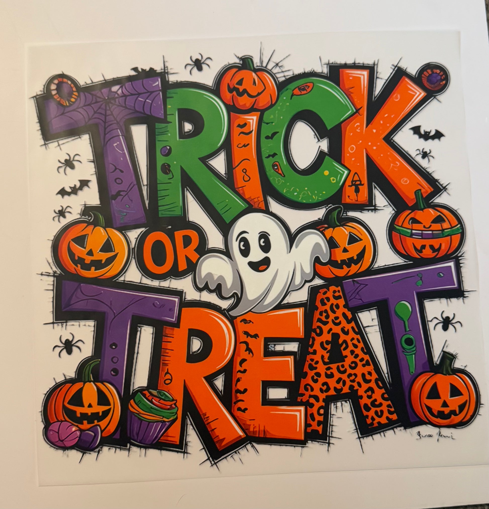 Level up your spooky style with this Trick or Treat Ghost & Pumpkins Heat Transfer.
