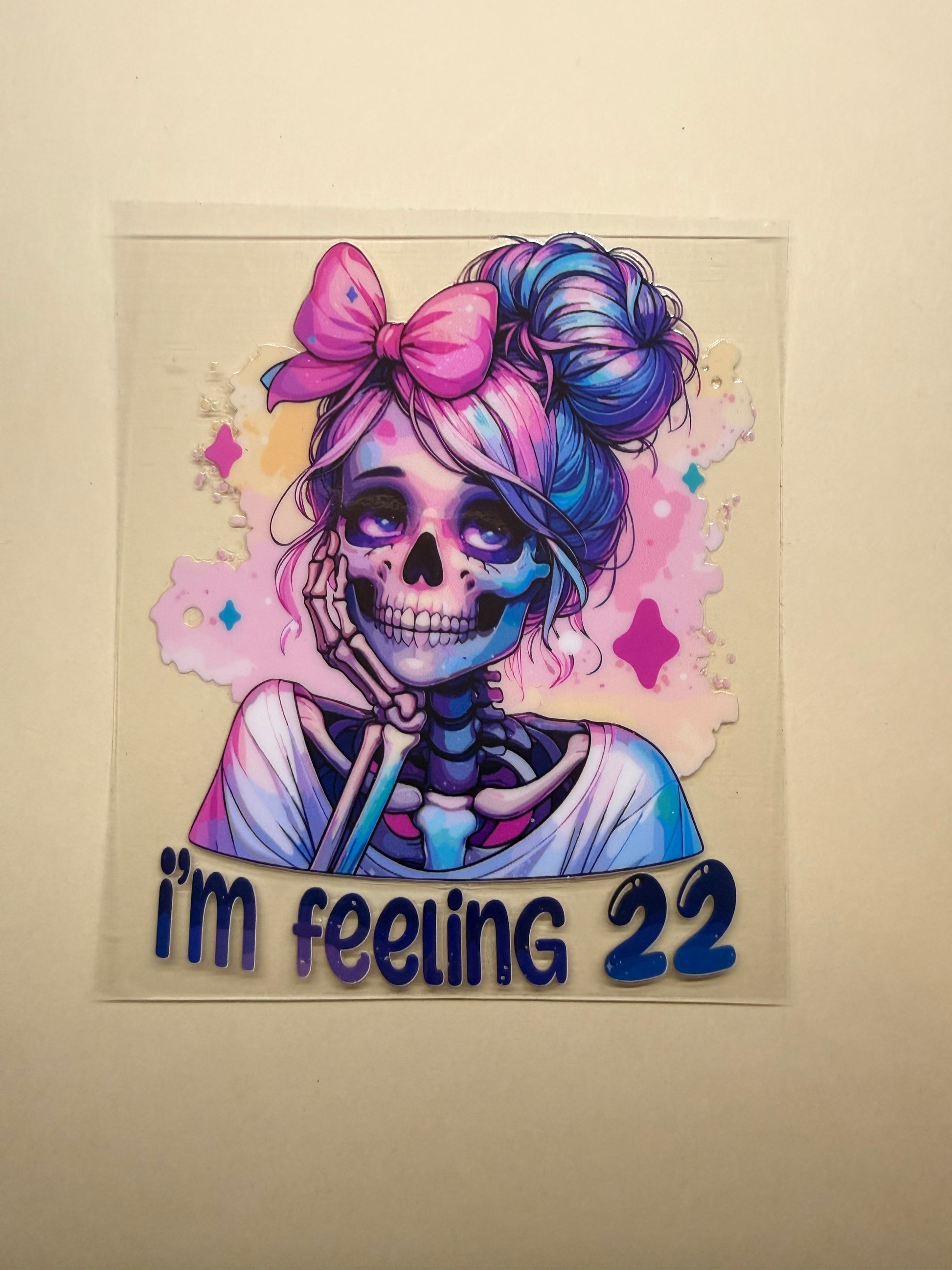 Celebrate in style with this bold and fun Iโ€™m Feeling 22 UVDTF Decal ๐Ÿ’€๐ŸŽ‰. Featuring a vibrant skeleton with pastel rainbow hair, a pink bow, and playful โ€œIโ€™m Feeling 22โ€ text, this decal is the perfect way to decorate tumblers, mugs, laptops, or party favors. Ideal for birthdays, gothic party themes, or anyone who loves colorful and spooky vibes.