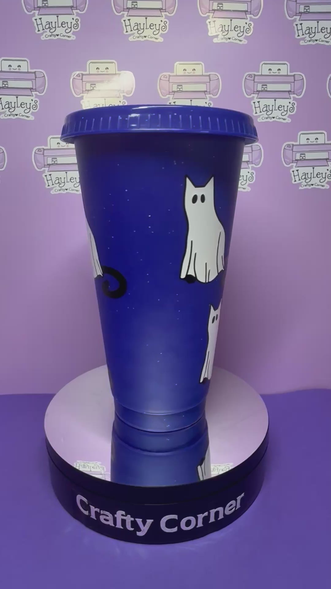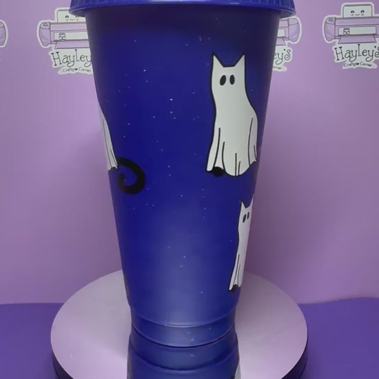 Sip in spooky-style with this fun reusable cup! Feayting a midnight blue background sprinkled with glitter and adorable white ghost cats, it's perfect mix spooky and sweet for Halloween season and beyond
