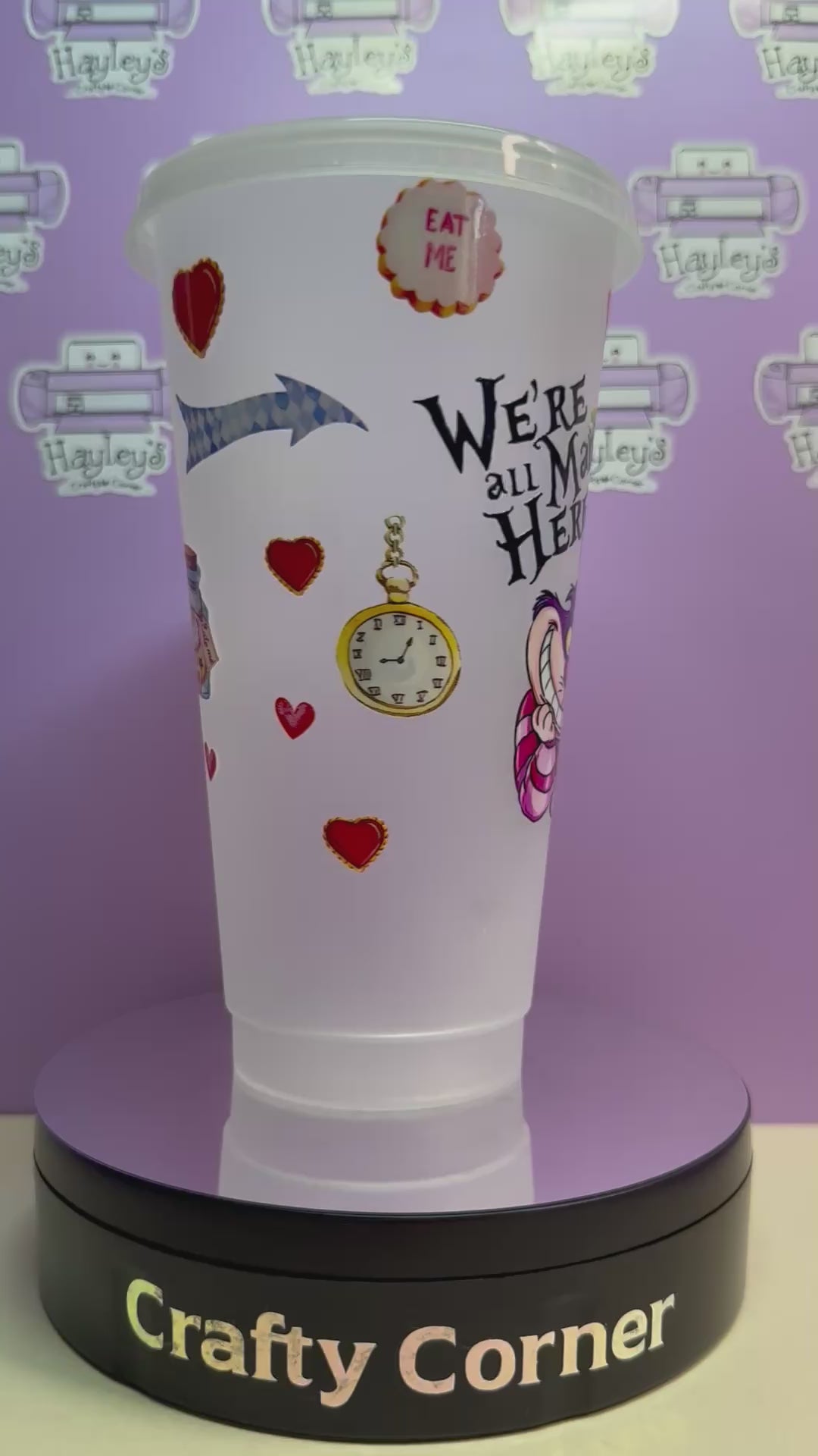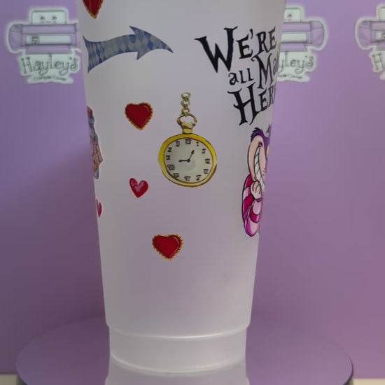 Step into Wonderland with this fun and whimsical cup! Featuring the mischievous Cheshire Cat and the famous quote "We're All Mad Here", this reusable cup is perfect for anyone who loves a touch of magic in their everyday drinks.