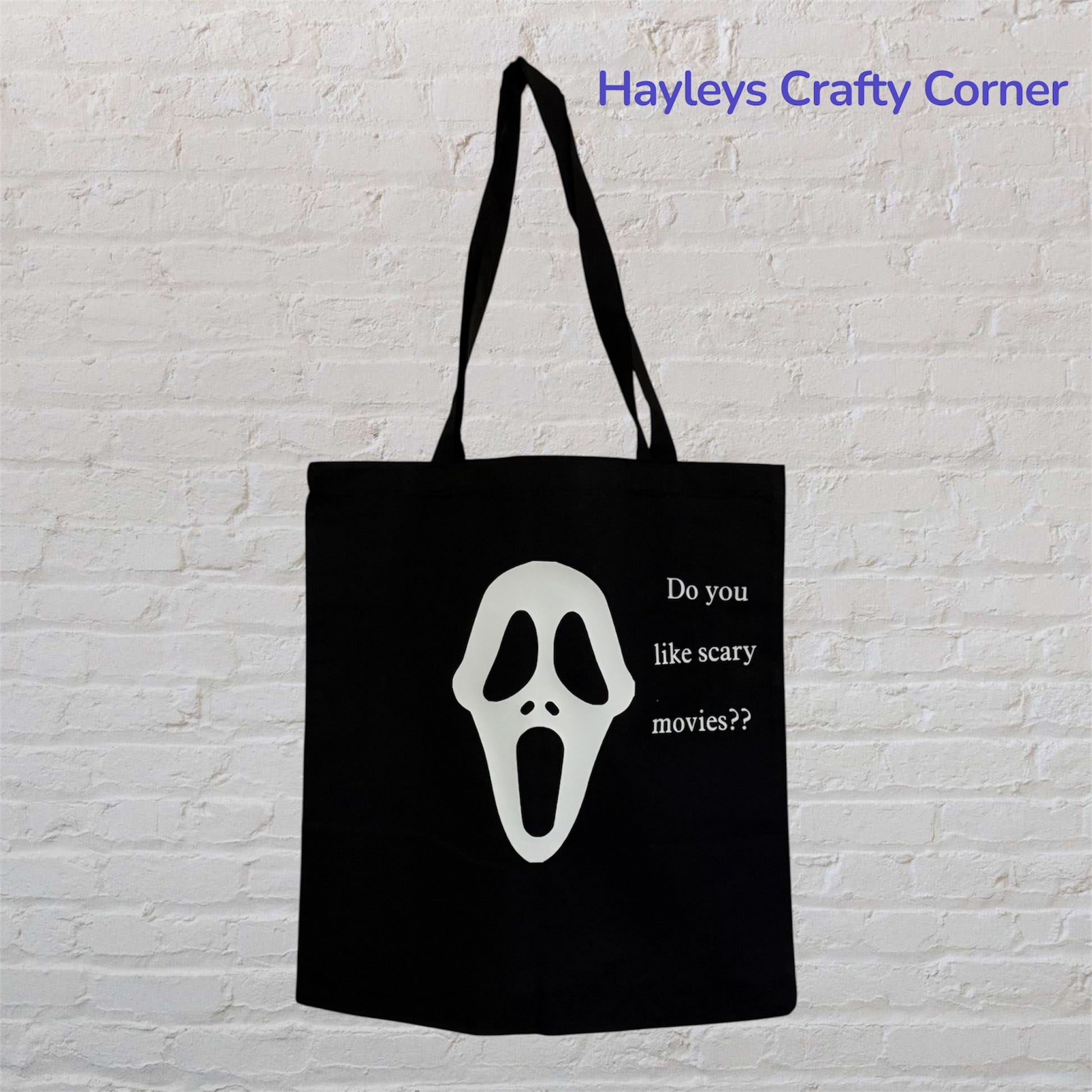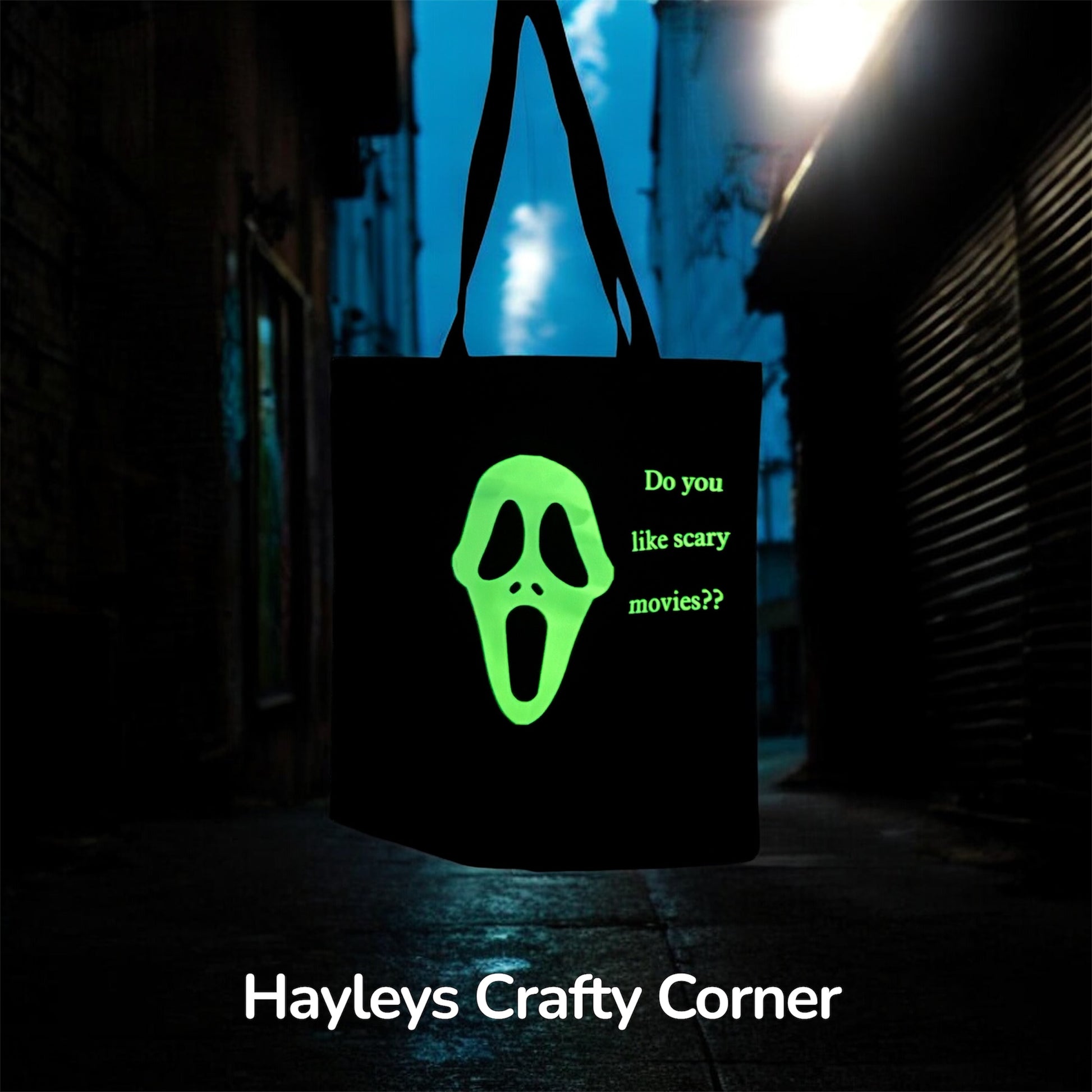 Carry out essentials with spooky style! This black horror-inspired tote bag features the iconic ghost face design with the chilling phrase " Do you like scary movies??. The best part? it glows in the dark, making it the perfect accessory for Halloween, horror fan or anyone who loves a bold statement piece.