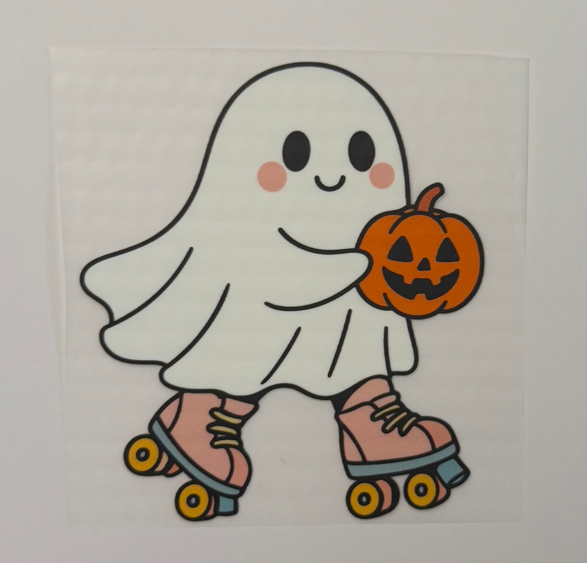 Roller Skating Ghost with Pumpkin Heat Transfer – Halloween Iron-On DIY
